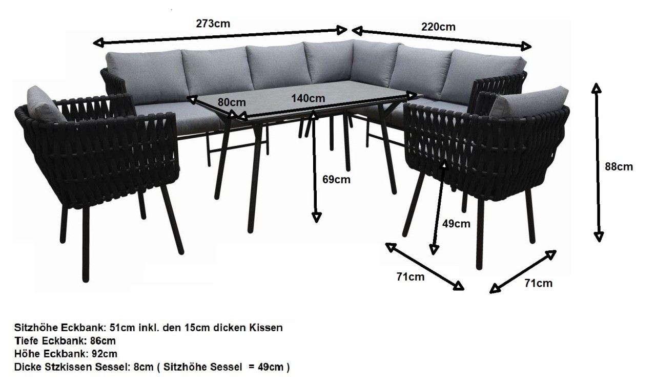 Zithoogte van de hoekbank inclusief de 15 cm dikke kussens = 51 cm.