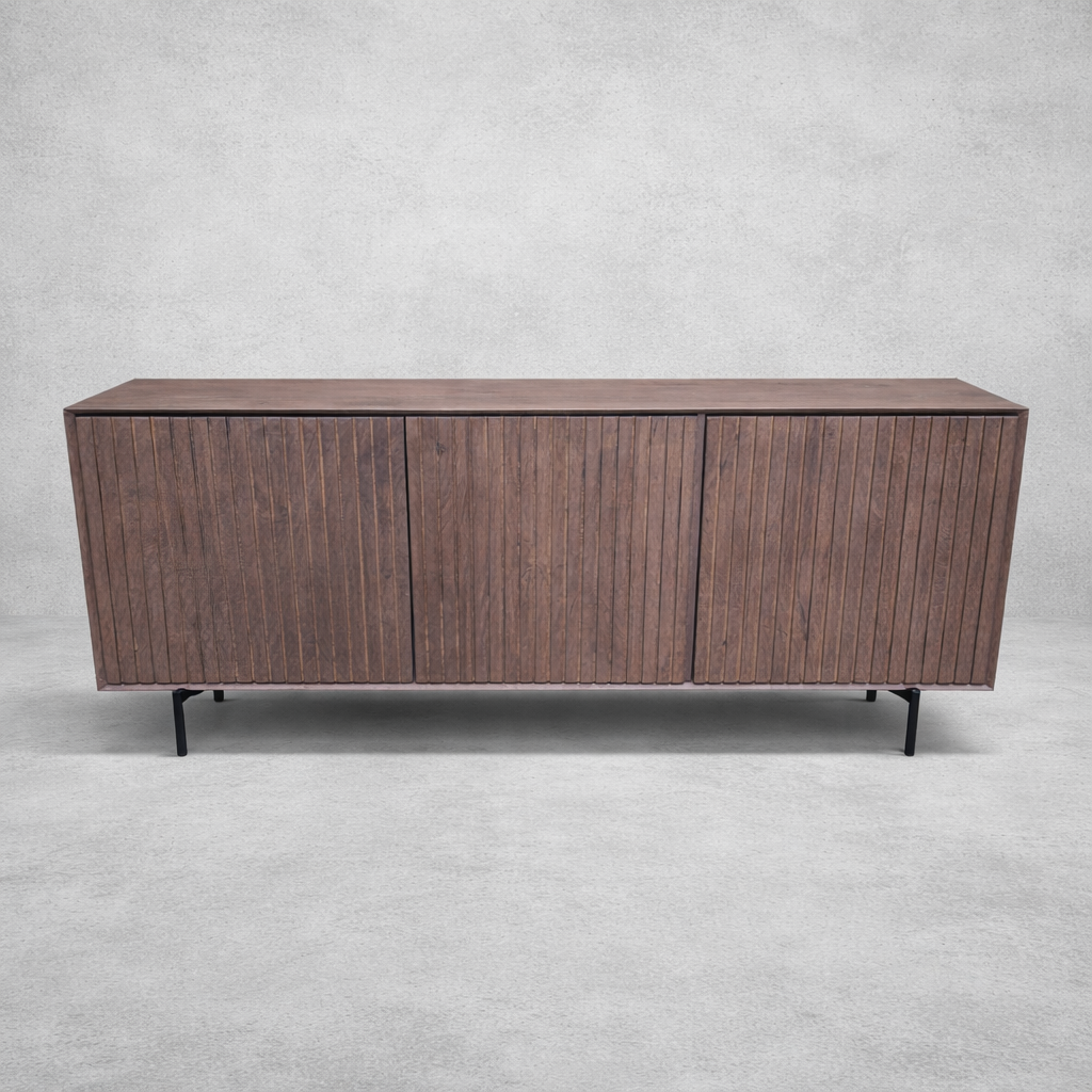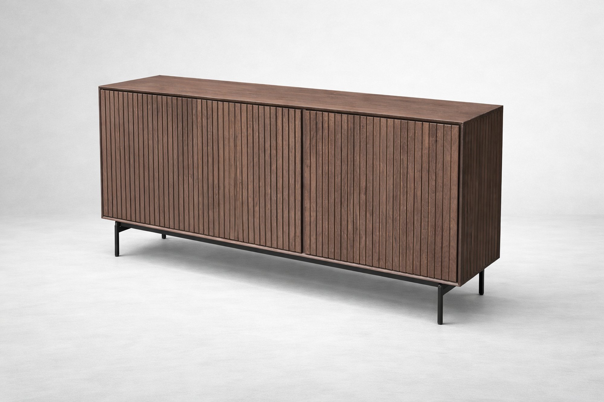 De houten poten van dit dressoir zijn netjes afgewerkt, wat een moderne en tijdloze uitstraling geeft. De buitenkant en zijkanten zijn voorzien van een verticaal lattenpatroon en afgewerkt met een bruine finish, wat een warme en elegante sfeer creëert.