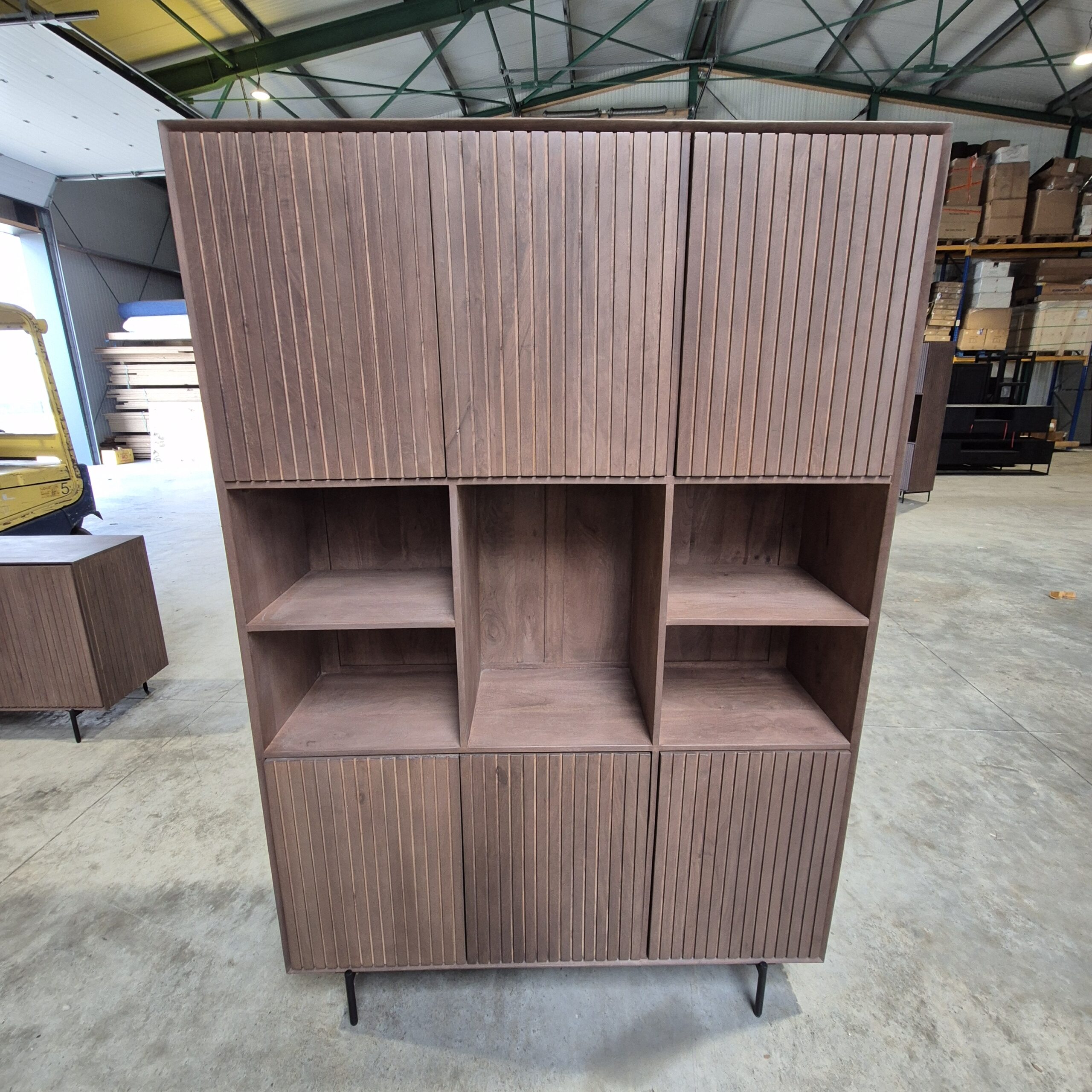 De vakkenkast is voorzien van zes deuren en vijf open vakken. De deuren zijn uitgerust met een verticaal lattenpatroon en zijn afgewerkt met een walnoot finish.